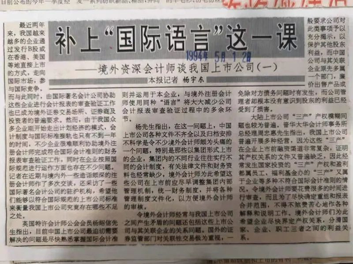 股票、债券本来就是“舶来品”,所以中国证券市场开设之初就非常强调和国际接轨,因为发行B股和H股的监管要求,上市公司需要聘请海外著名会计师事务所进行审计,但是碰到了一个很大的障碍就是境内外会计制度和准则不一致,常常导致巨大的审计差异,让投资者无所适从,上市公司也是头痛不已。我花了两周时间,采访了包括当时的“六大(国际会计师事务所)”中国合伙人在内的一批业内人士,从现象到弊端,再到解决方案,连续刊登在1994年5月的报纸头版,呼吁尽快推进境内会计制度和准则与国际接轨。这也是国内最早探讨这一课题的深度报道,得到了很多业内人士包括交易所领导的赞扬。