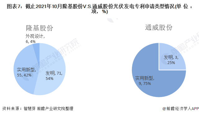 (4)专利类型对比:隆基股份以发明专利为主,通威股份以实用新型为主