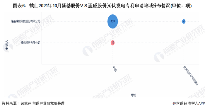 目前,隆基股份和通威股份的光伏发电专利申请区域主要集中在中国,两者在中国申请的光伏发电专利数量分别为133项和12项。