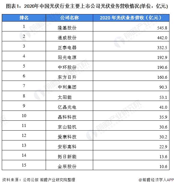 从2020年光伏发电行业主要上市公司光伏发电相关业务的营收规模看,隆基股份和通威股份排名分别位列第一和第二,2020年隆基股份光伏发电行业相关的营收规模为545.8亿元,而通威股份光伏发电行业的相关的营收为442亿元,较第三名比较均存在较大的优势。