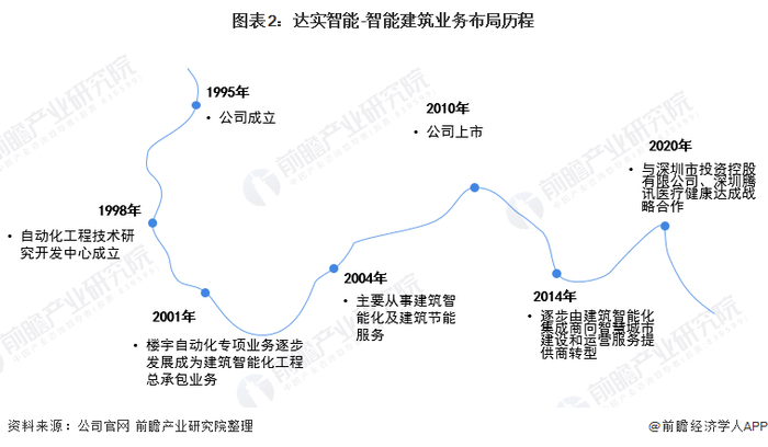 1995年,达实智能成立;1998年,公司成立自动化工程技术研究开发中心;2001年,达实智能楼宇自动化专项业务逐步发展成为建筑智能化工程总承包业务;2004年,公司以建筑智能化及建筑节能服务作为主营业务;2013年,公司开始拓展绿色医疗、数据中心等新兴细分领域;2014年,公司建筑智能化业务再度转型,逐步由建筑智能化集成商向智慧城市建设和运营服务提供商转型。