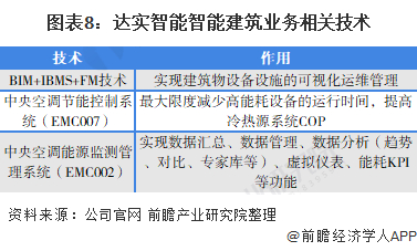 从技术来看,达实智能智能建筑业务相关技术起到建筑物设备设施可视化运维管理、减少高能耗设备的运行时间、数据管理、数据分析等作用: