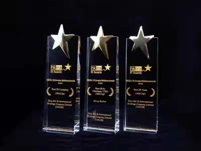 张宇晨:由香港投资者关系协会(HKIRA)主办的“2021年第七届香港投资者关系大奖”获奖名单近日公布了,周黑鸭荣获了最佳投资者关系公司、最佳投资者关系团队,以及最佳投资者关系(行政总裁)三项大奖。