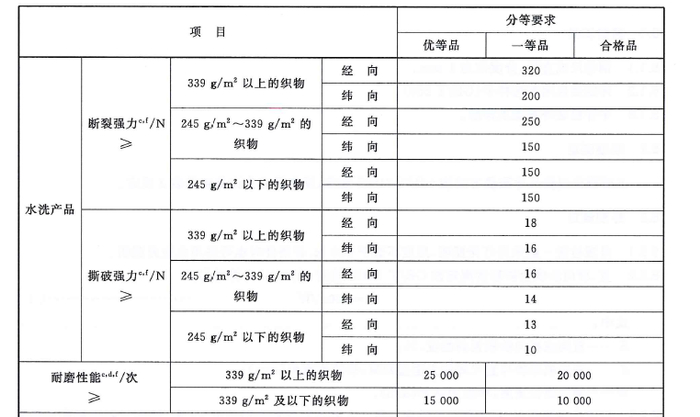撕破强力、断裂强力、耐磨性能都是牛仔服装重要的使用性能。撕破强力是用于评价织物在使用过程中抵抗沿裂口或破损方向撕破的能力,能客观反映纺织品在实际穿着中突然撕裂特性和受整理加工影响的程度;断裂强力指在规定条件下进行的拉伸试验过程中,试样被拉断记录的最大力;耐磨性能是反映牛仔服装使用寿命的重要指标之一,也是生产企业和消费者关注的指标。耐磨性不佳的服装,穿着后容易破损,影响产品的使用周期。在FZ/T 81006—2007《牛仔服装》中,按牛仔面料单位面积质量对撕破强力、断裂强力、耐磨性能的指标要求进行分档,具体如下图所示。