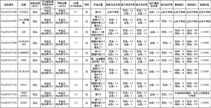 1 | NAAF21071105 | 牛仔裤(水洗产品) | ZARA | 199 | 未检出 | 未检出 | 无 | 5.2 | 符合 |