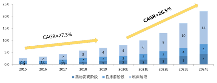 中国 CRO 行业虽然起步晚、但是基于政策利好、资本追捧、可借鉴的国外经验充足、工程师红利等多种原因,行业增速远超全球平均水平。据Frost & Sullivan数据显示,中国 CRO 行业规模将在 2024 年达到 222 亿美元,预计 2019 年-2024 年 CAGR 为 26.5%,其中药物发现领域为26.0%、临床前领域为 18.2%、临床领域为 30.0%。(如图1)