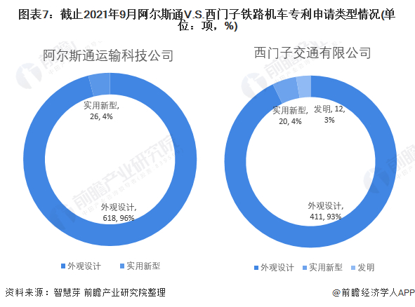 阿尔斯通和西门子铁路机车专利申请类型以外观设计专利为主。阿尔斯通的外观设计铁路机车专利占比达到96%;西门子外观设计铁路机车专利占比达到93%。