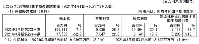 10月29日,角川集团发布2022年3月期第二季度(2021.4.1-2021.9.30)财报,销售额1048亿1100万日元,同比增长7.4%;营业利润99亿3800万日元,同比增长26.6%;经常利润106亿400万日元,同比增长30.3%;归属股东当期纯利润71亿1600万日元,同比增长36.7%。全面增收增益。