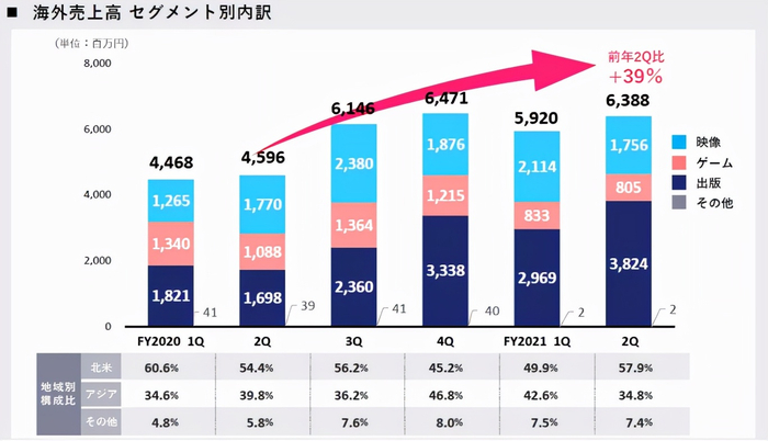 海外销售额到第二季度为止,达到123亿800万日元,比去年增长了13%。其中以漫画轻小说为中心的出版事业为67亿9300万日元,影像事业为38亿7000万日元,大半为北美地区贡献。