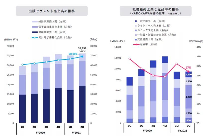 角川集团以北美战略子公司YenPress为中心,包括亚洲在内的海外事业持续高速成长;在日本国内,跨媒体制作源泉的漫画及儿童书籍种类都很畅销,以获得直木三十五奖和山本周五郎奖的《テスカトリポカ》(文艺单行本)为首,《魔力的胎动》(一般文库)、《面包小偷》(儿童书)、《文豪野犬(21)》(漫画)等书籍销售情况也保持良好走势。