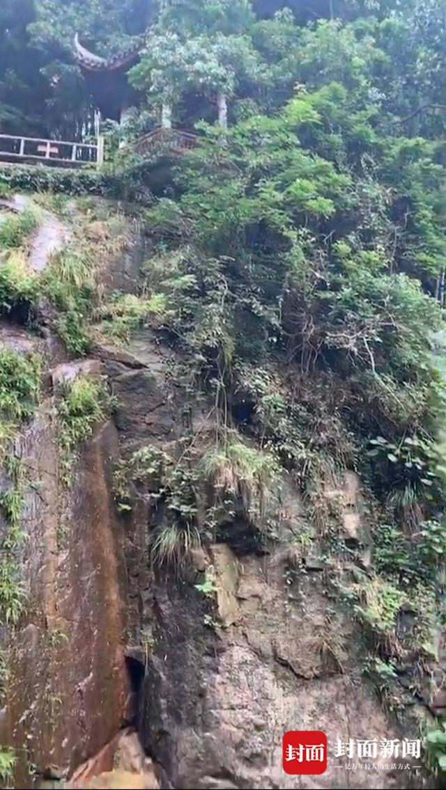 据现场视频显示,凉亭位于一处陡壁边缘,陡壁上部分有部分树木,下部分为乱石。