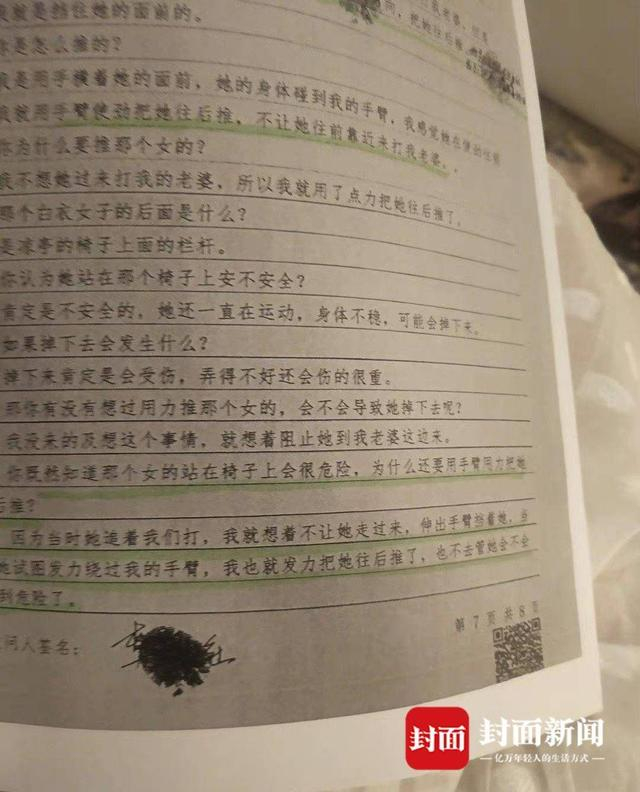 卢女士提供的一份笔录中,樊某称当时卢女士站在凉亭椅子上比较危险,但看到老婆被追着打,想着不让卢女士过来,就发力把她往后推,没去考虑她是不是有危险。