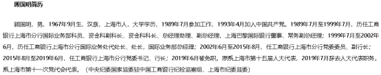 简历显示,1967年9月在上海出生的顾国明,自1989年起就在工行上海分行工作,到2019年6月公告被查,他已在该行工作约30年。