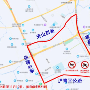 (二)11月4日至11月10日,每日6时至21时,沪青平公路-华徐公路-天山西路-华翔路合围区域(不含上述道路),禁止载货机动车和摩托车(含轻便摩托车)通行。