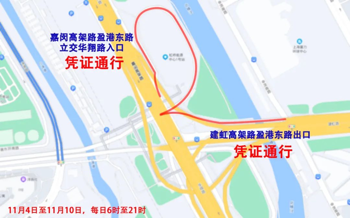 (三)11月4日至11月10日,每日6时至21时,涞港路(崧泽大道-盈港东路)、嘉闵高架路/盈港东路立交华翔路入口及建虹高架路盈港东路出口,除执行公务的警车、消防车、救护车、工程抢险车,公共汽(电)车,出租车,持有公安机关核发的各类进博会车辆证件和《控制区预约停车证》的车辆外,禁止其他机动车通行。