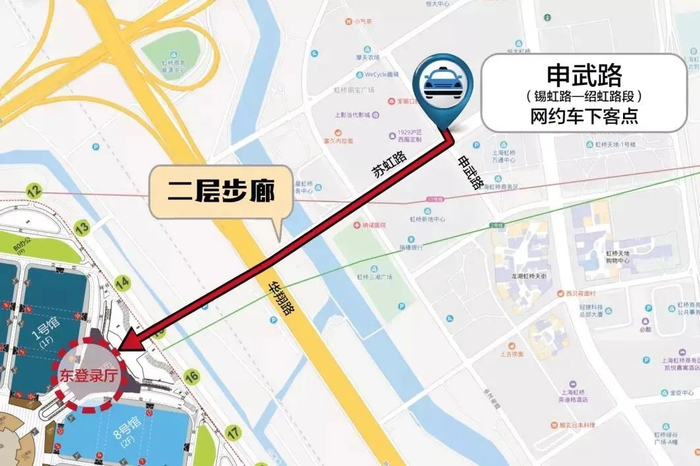 建议线路:从申武路(网约车下客点)出发,登上二层步廊,沿二层步廊继续向西步行,最终到达国家会展中心东登录厅。