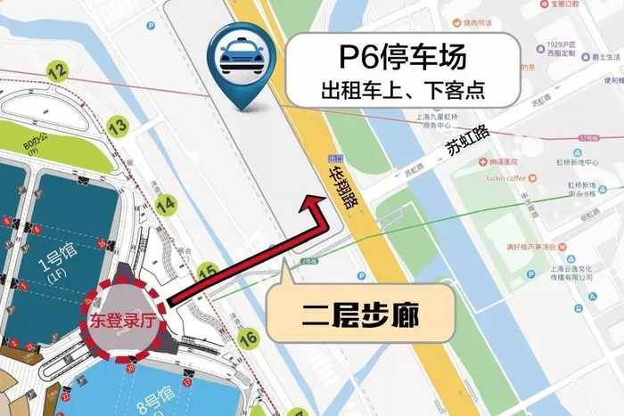 建议线路:从国家会展中心东登录厅出发,沿二层步廊向东步行,至P6停车场下楼梯,到达出租车乘客排队区候车。