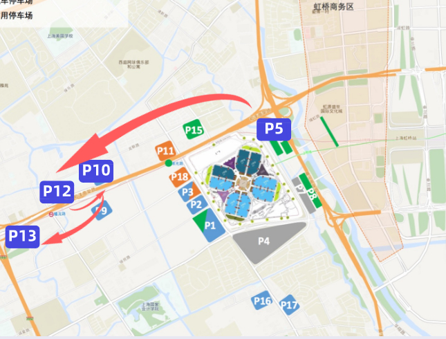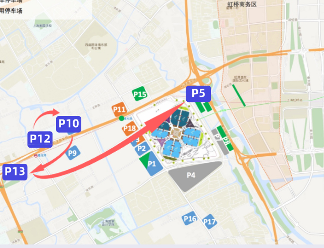 进口博览会期间,观众可选择酒店穿梭巴士到达P5停车场。