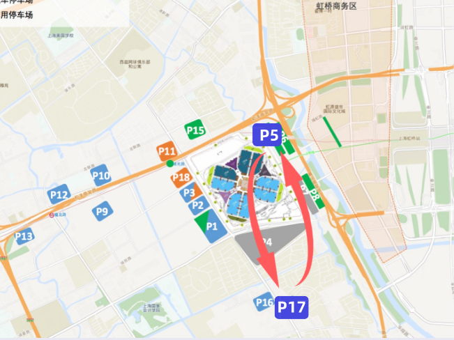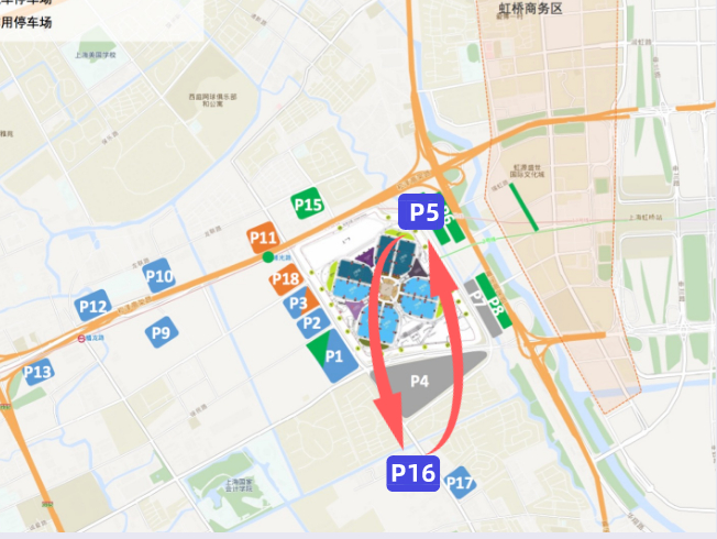 进博会举办期间,提供11处临时停车场、16处虹桥商务区停车场(库)供参展商客预约停车。