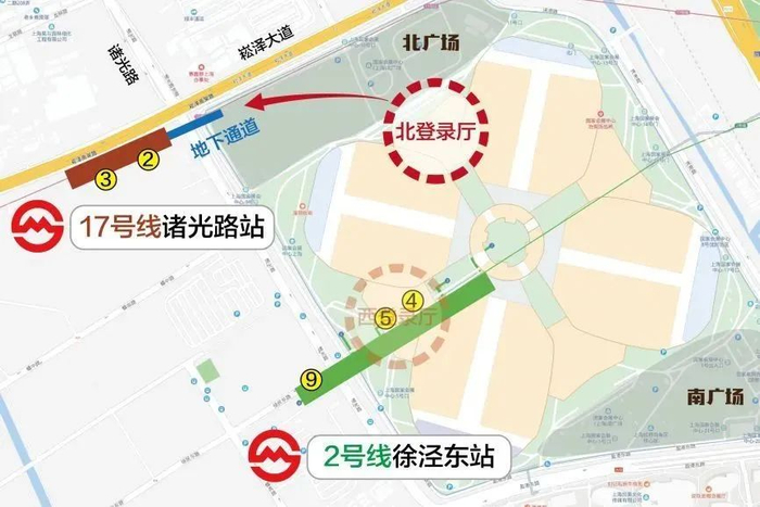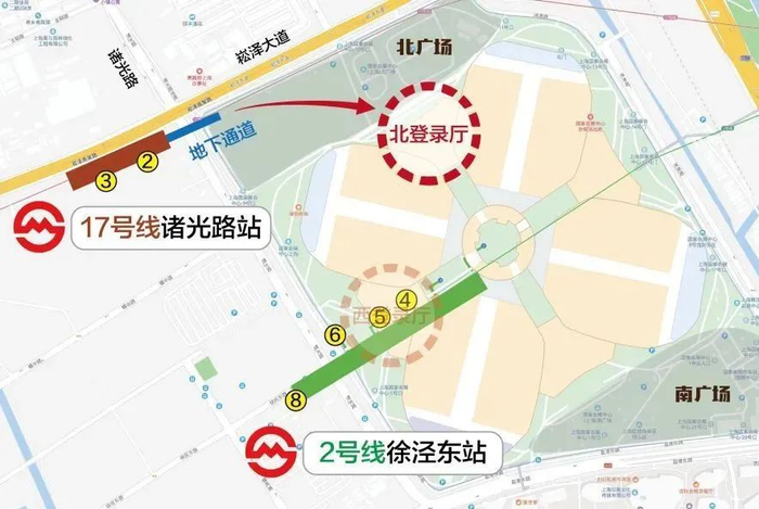 观众可根据场馆的标识指引到达北广场西北角,通过过街地道前往17号线诸光路站。