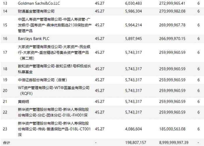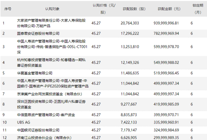 最终获配的发行对象共计23名,发行股票数量约为1.99亿股,募资总额约为90亿元。其中,一位名为“黄晓明”的投资者现身,获配约2.6亿元。