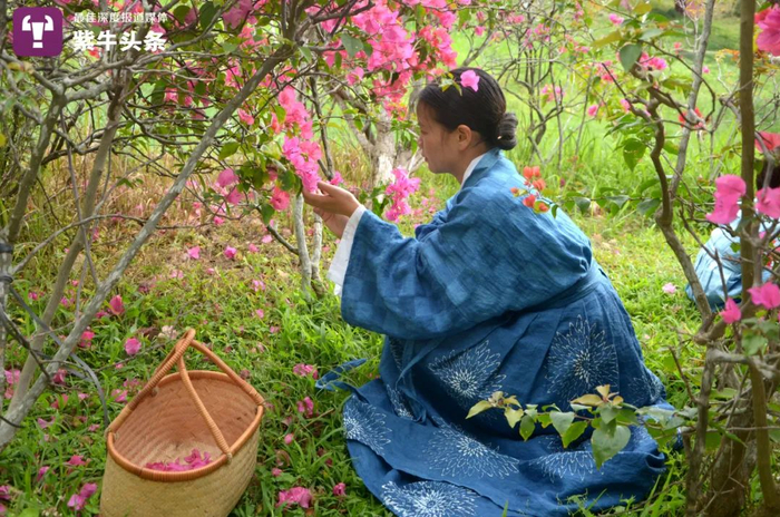 近日,一名网友发布的采集四季草木为汉服染色的视频走红。视频画面唯美,主人公用植物染出的衣服古典雅致,斑斓绚丽,引来不少网友赞叹:“有返璞归真之感。”扬子晚报紫牛头条记者联系到视频的发布者,她是一位80后的云南女子,网名“栖蓝”。因为热爱植物染,她自学研究这项传统技艺六年。她花了两年时间采摘四季鲜花、野草、树叶等原材料,在白色布匹上染出中国传统色彩,制作成汉服。她说:“这些美丽的色彩,我都曾在古诗词里读到过。我把它们染出来,穿在身上,感觉这些古诗里描述的色彩真正鲜活了起来。”