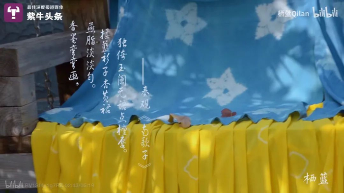 视频中每一个场景都可以找到一首描写颜色的古诗相对应。“香墨弯弯画,燕脂淡淡匀。揉蓝衫子杏黄裙,独倚玉阑无语点檀唇。”“栖蓝”身着蓝衫和杏黄裙,用香墨勾画出弯弯的眉毛,将胭脂淡淡地涂在脸上,仿佛古诗中的人物。
