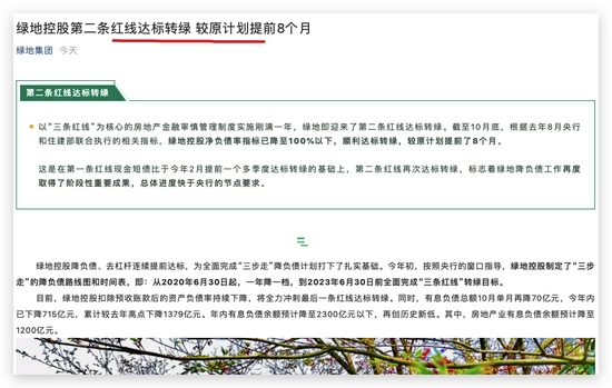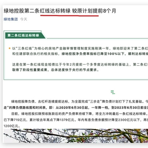 从绿地集团官微获悉,绿地集团发布消息称“绿地控股第二条红线达标转绿,较原计划提前8个月”。