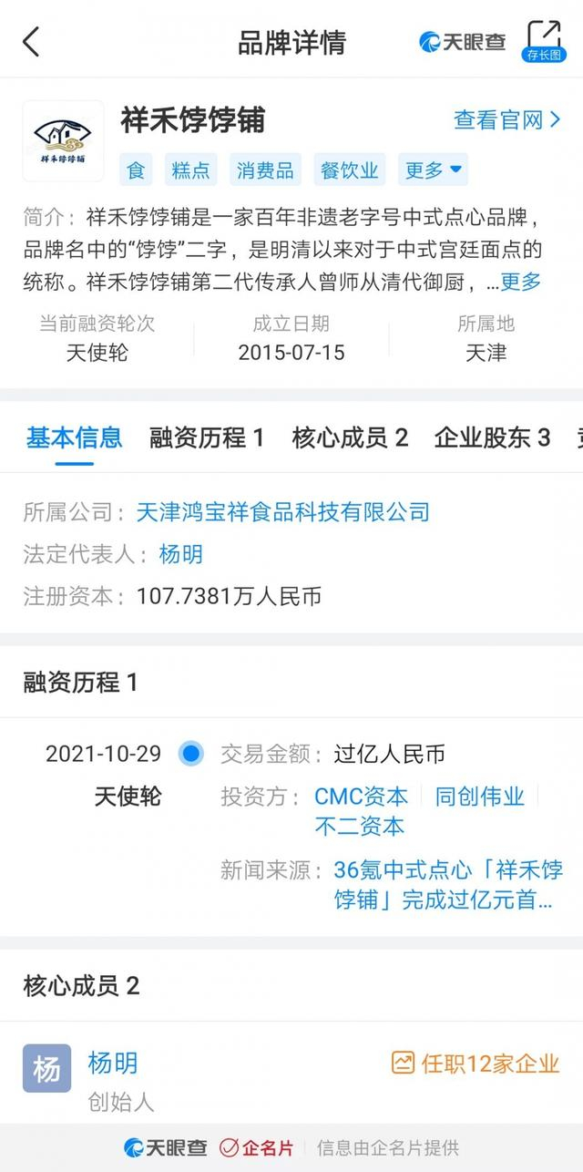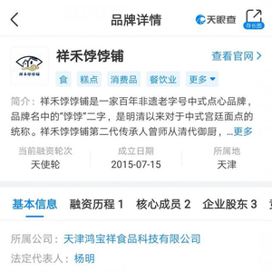 天眼查显示,祥禾饽饽铺成立于2015年,是一家百年非遗老字号中式点心品牌。2018年该店曾被《舌尖上的中国3》节目报道,具有较高的区域知名度,目前在天津有十余家门店。产品主要包括糕、酥、饼三类,其中有贵妃饼、枣花酥等传承宫廷点心技艺手法制作的古法产品;也有无名糕、一合酥等对传统口味的轻度创新尝试;以及松仁奶酥、白团子等融合地方特色及西点元素的点心。
