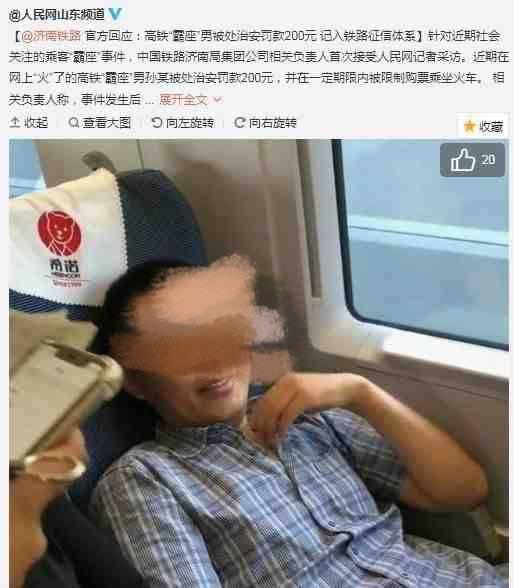 2018年8月21日,在从济南开往北京的高铁上,一名男乘客不肯对号入座,却抢占女乘客的座位,列车长和乘警劝说无果。对此,济南铁路局客服表示,强行霸占其他乘客座位的行为属于扰乱公共秩序,乘警可对其采取强制措施。8月24日,高铁“霸座”男孙某被处治安罚款200元,并在一定期限内被限制购票乘坐火车。