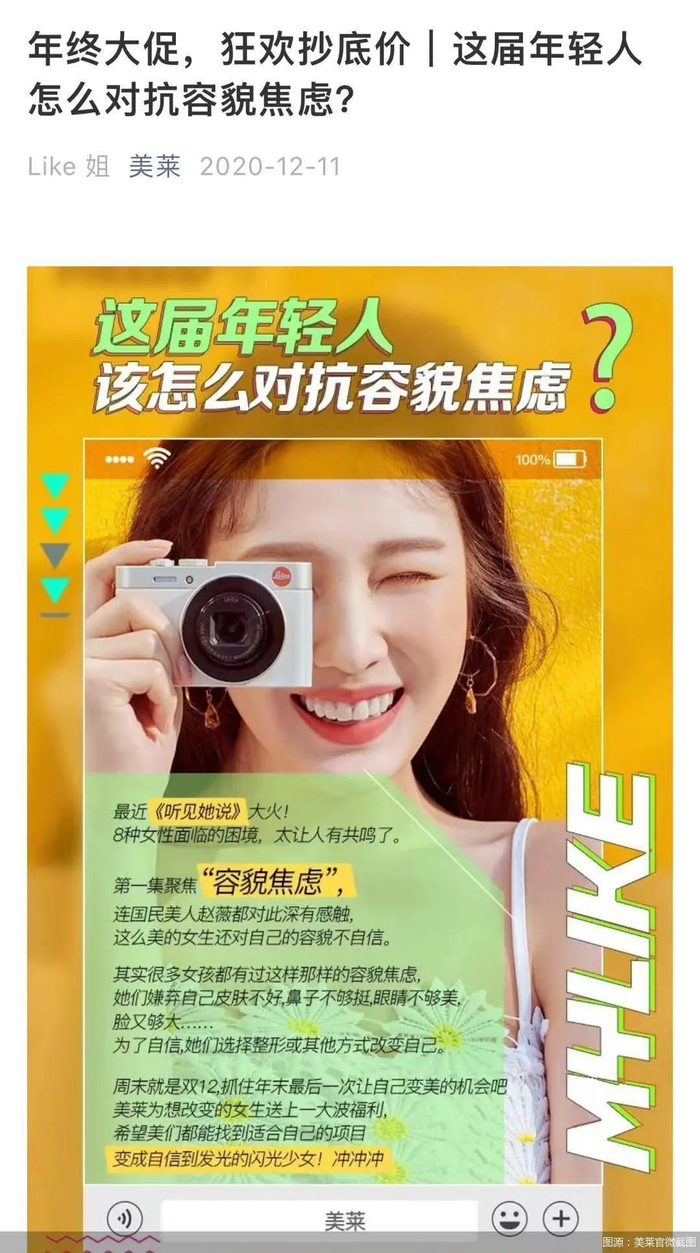 《这届年轻人该怎么对抗容貌焦虑?》是美莱在其官方微信公众号刊发的一文,推文中,美莱将容貌焦虑和整形两个话题结合起来,紧接着在推文附上了各个项目的价格。