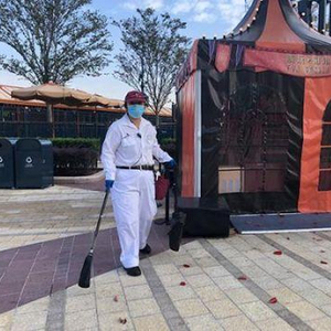 工作人员在迪士尼小镇清扫落叶图片来源/澎湃新闻