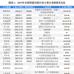 目前,国内智能安防上市公司包括海康威视、大华股份、千方科技、苏州科达、佳都科技等,以及非上市公司旷世科技、商汤科技、云从科技、依图科技等。