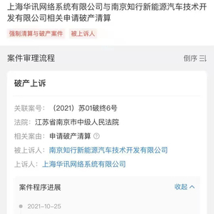 然而,到了今年7月,拜腾汽车等来的却是破产清算。7月12日,南京知行新能源新增破产重整信息,案号为(2021)苏0113破申26号,经办法院为南京市栖霞区人民法院,申请人为上海华讯网络系统有限公司。10月25日,该案件被上诉到南京市中级人民法院。