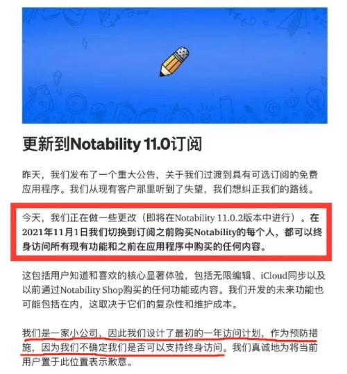 由于国内外用户的反对声实在太大,11月3日,Notability发布公告道歉,表示会纠正更新付费模式的做法,在2021年11月1日前购买该应用的用户,之后可以继续享受该应用的全部服务内容。不过作为一家小公司,官方并不确定Notability是否可以支持终身访问。