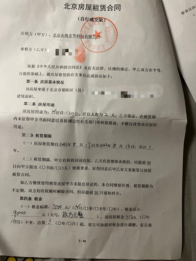张伟以“北京山海玄乎科技有限公司”的名义和租客签的租房合同。