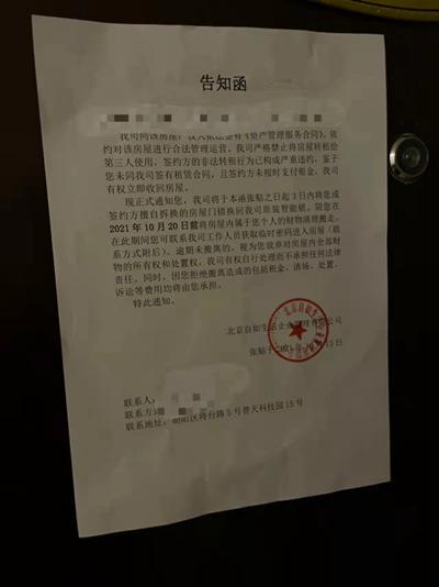 10月13日,王晨房门被贴上一张盖有自如公司公章的“告知函”,告知函称,这套房子的承租公司未按时支付租金,自如方要求王晨在10月20日前搬离。