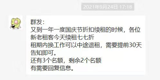 张伟给租客群发的续租打折信息。