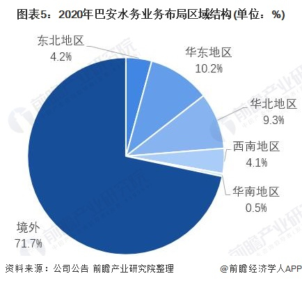 从区域分布来看,巴安水务负责海水淡化业务的全资子公司DHT(现已更名为SWT)位于美国,主要业务布局在境外,2020年公司境外业务占比达到71.7%,境内业务占比最高的地区是华东和华北地区,分别达到10.2%和9.3%。