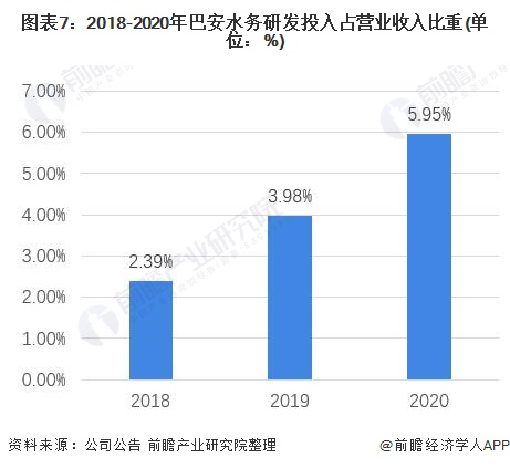 巴安水务将技术研发作为构建核心竞争力的关键,始终坚持并高度重视对技术创新的投入。2018-2020年公司研发投入占营业收入比重逐年上升,2020年达到5.95%,研发人员数量占比达到12.57%,公司及境内重要子公司已拥有超过100项专利。