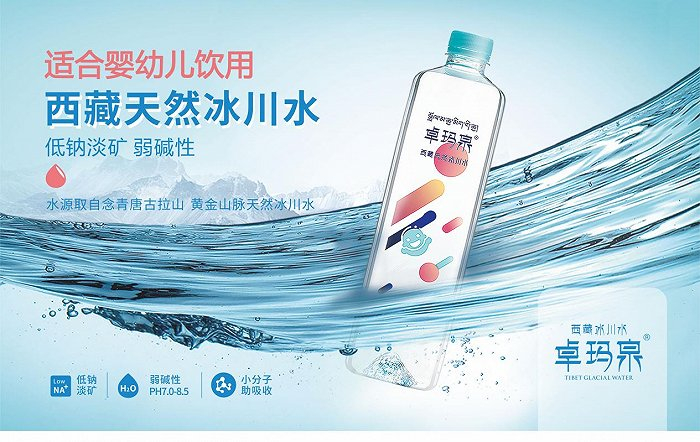 “卓玛”是藏族对女子的称呼,象征着美丽的女神。卓玛泉发源于西藏海拔3700米的念青唐古拉山脉南坡的史前冰川,经过长时间冰川岩层自然过滤后形成的高原天然冰川水,与现代污染完全绝缘,未经任何工业化循环,被誉为“水质天然纯净、活性度高、矿物质自然平衡”的天然饮用水。