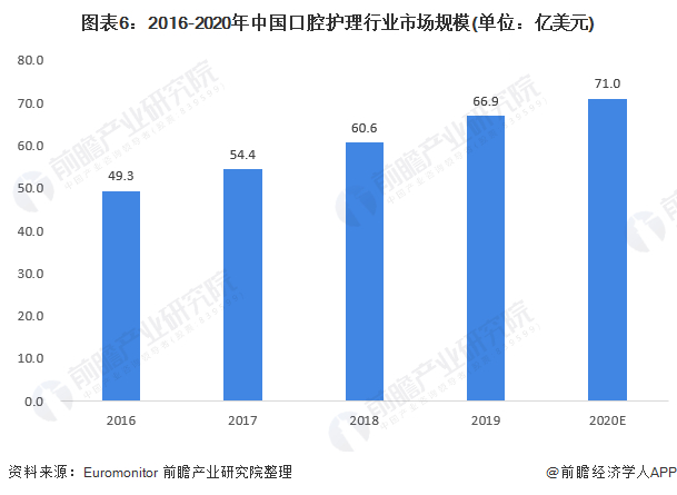 在政策和国民口腔护理意识不断提高的双重助力下,我国口腔护理市场规模也呈现不断增长的态势,2016年以来我国口腔护理行业市场规模从49.3亿美元,增长至71亿美元,行业处在快速成长阶段。