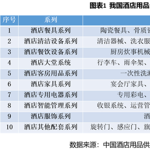 根据使用情況及产品类型划分,目前,我国酒店用品主要分为十个系列,包括酒店餐具系列、酒店清洁设备系列、酒店餐饮设备系列、酒店大堂系列、酒店客房用品系列、酒店家具系列、酒店专用电器系列、酒店智能管理系列、酒店服饰系列、酒店其他配套系列。