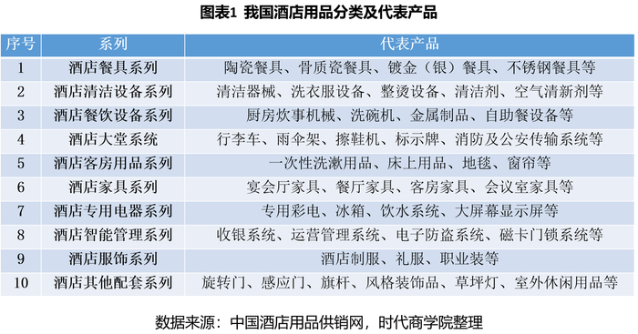 酒店用品是为酒店提供专供服务的相关产品,即为满足酒店、餐厅及会所营运需求的一系列产品。作为酒店经营必不可少的软硬件,酒店用品市场的变化发展与酒店运营需求紧密相关。