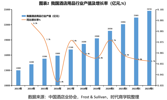 根据酒店用品协会的资料,2018年,酒店用品产值约为1.82万亿元,2013-2018年的复合年增长率为6.9%,市场规模持续稳定增长。而全球企业增长咨询公司Frost & Sullivan(弗若斯特沙利文咨询公司)的研究报告预测,2018-2023年,中国酒店用品市场的复合增长率约为6.4%,酒店用品产值将在2023年达到2.47万亿元,酒店用品市场规模有望维持稳定增长。