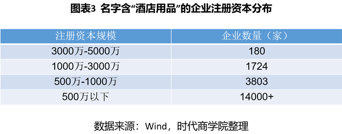 以企业数量与企业资金规模为观察视角,可见一斑。Frost & Sullivan的研究报告显示,2018年,中国有超过17000家酒店用品制造商。时代商学院统计,截至2021年10月18日,wind全球企业数据库中搜索名字里含“酒店用品”的境内存续企业有19977家,其中注册资本在3000万-5000万的仅有180家,注册资本在1000万-3000万的仅有1724家,注册资本在500万-1000万的为3803家,注册资本在500万以下的超过14000家。