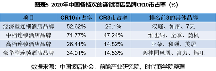 我国酒店业的品牌格局也呈现较高的集中度。前瞻产业研究院的最新报告显示,2020年,我国经济型连锁酒店品牌CR10的市占率为52.61%,我国中端(三星级)连锁酒店品牌CR10的市占率为70.77%,我国高端(四星级)连锁酒店品牌CR10的市占率为26.41%,豪华型(五星级)连锁酒店品牌CR10的市占率为34.01%。