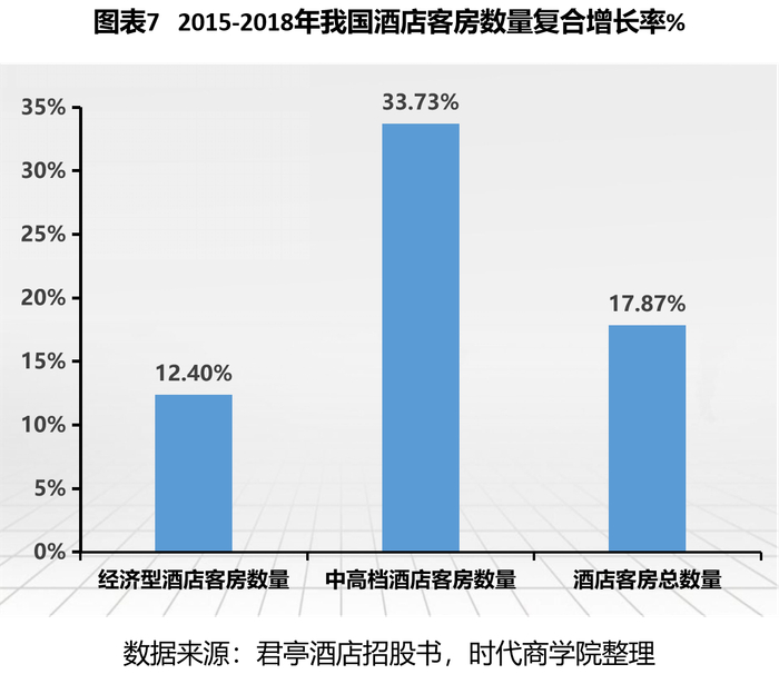 中国饭店协会发布的2015-2019年《中国酒店连锁发展与投资系列报告》显示,2015-2018年,中国酒店客房数量从215.01万间增长到了 414.97万间,期间的年均复合增长率为17.87%,其中经济型酒店客房数量的复合增长率为12.40%,中高端酒店客房数量的年均复合增长率为33.73%。也就是说,在当前消费升级趋势下,我国中高端酒店的结构占比在不断提升,向欧美市场的酒店市场结构靠近,在未来成为我国酒店的主体类型。