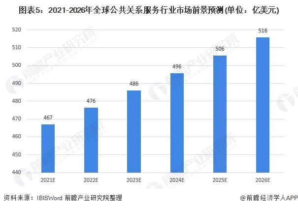 在未来全球公关服务市场规模增长上,IBISWorld称在一系列积极的宏观经济预测中,全球公共关系服务行业将在经济持续回暖和发展中获取更多的市场,并且依靠着信息通信技术的快速发展,公关企业的业务水平和程序创新也将得到进一步加强。未来在2021-2026年中全球公共关系代理行业预计将以1.6%的年均增长率增长,即从467亿美元增长至516亿美元。