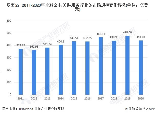 在全球公关服务市场规模发展上,根据IBISWorld统计,从2011-2020年全球公共关系服务行业的市场规模在波动变化,总体来说,全球公共关系服务行业的市场规模增长速度快于整体经济增长,但是全球公共关系服务行业的市场规模增长慢于全球商业活动部门的整体增长。2011年,公共关系服务行业的市场规模为372.72亿美元,2019年全球公共关系服务行业的市场规模增长到478.06亿元,2020年由于疫情原因同比下降7.75%,为411.03亿美元。
